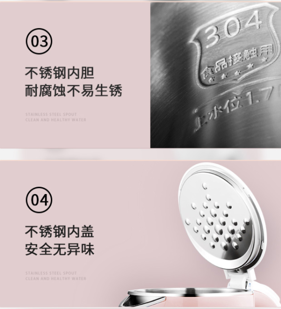 規(guī)格參數(shù)產(chǎn)品尺寸長198mm;寬153mm;高218mm額定功率1500W產(chǎn)品凈重1kg電源線長0.7m額定電壓220V功能參數(shù)適用場景家用主體參數(shù)認(rèn)證型號(hào)WHJ1705b容量1.7L顏色粉色包裝清單電水壺x1,電源底座x1,說明書保修卡x1,包裝箱x1